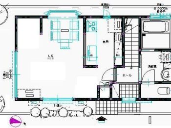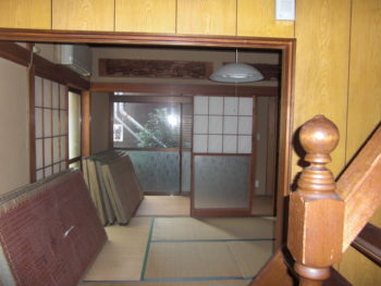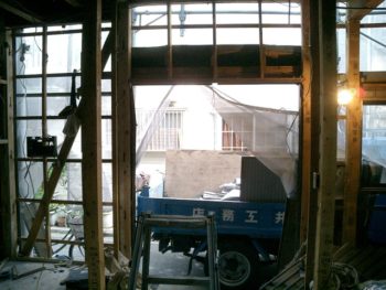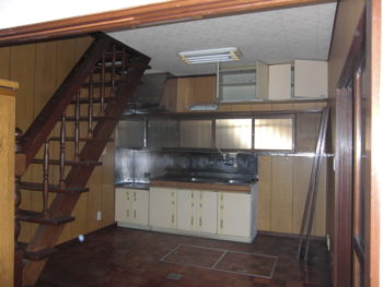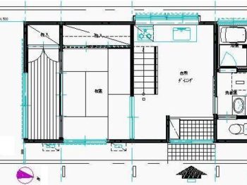 1階1DK、2階2間の昭和50年頃の建物。1階の居間であるところは広縁付きの和室で、階段を挟んで向こうに台所があり、その無効がトイレ、洗面、お風呂となっています。とにかくその階段が1DKを遮断して狭く感じる間取りでしたので、広いLDKがほしいとのご要望でした。そうすると洗面、風呂以外の1階の壁、全てを取り除くような感じにしなければ、ワンフロアーの間取りにはなりません。まず構造をチェックし階段を移動させられるかから検討しました。